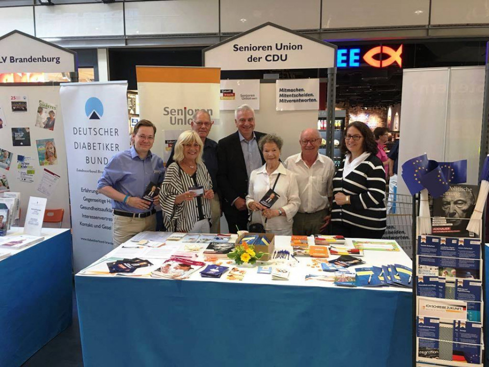 Die 25. Brandenburger SeniorenWoche ist heute in Potsdam gestartet. Wie jedes Jahr wirbt auch unsere Senioren-Union mit Giveaways, Positionspapieren und Info-Flyern für politisches Engagement. Gemeinsam mit der Frauen-Union und unserem OB-Kandidaten, Götz Friederich, haben wir unsere Senioren-Union dabei unterstützt. Wir stehen zusammen, Männer und Frauen, von jung bis alt. Natürlich haben wir auch Werbung für die JU Diskussionsveranstaltung am 27. Juni zum Thema Altenpflege gemacht. Kein Ort wäre besser dafür gewesen als die SeniorenWoche. Wir wünschen allen Besuchern viel Spaß und viele wertvolle Informationen und Anlaufpunkte, die das Leben im Alter lebenswerter machen.