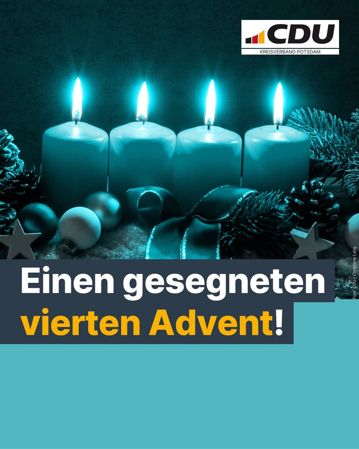 Mit dem vierten Advent rückt Weihnachten spürbar näher. 🕯️🕯️🕯️🕯️Es ist die Zeit, in der wir innehalten, zurückschauen und zugleich nach vorne blicken: Was stärkt unsere Gemeinschaft? Was macht unser Potsdam lebenswerter?Als CDU Potsdam arbeiten wir weiter daran, Antworten zu geben ? verlässlich, bodenständig und mit Blick auf das Gemeinwohl.Wir wünschen einen friedlichen vierten Advent und eine gesegnete Weihnachtszeit! 🎄✨