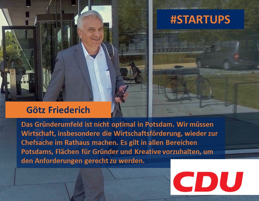 Götz Friederich stellt fest, „dass in Potsdam das Umfeld für Gründer nicht optimal ist. Wir müssen Wirtschaft - insbesondere die Wirtschaftsförderung - wieder zur Chefsache im Rathaus machen. Zunächst müssen wir gemeinsam mit den Investoren dafür Sorge tragen, dass die aktuellen Bauprojekte (bspw. RAW-Halle, Lok-Schuppen) schnell umgesetzt werden. Es gilt in allen Bereichen Potsdams, Flächen für Gründer und Kreative vorzuhalten, um den Anforderungen gerecht zu werden. Wir dürfen Potsdams Juwelen - unsere Absolventen - nicht ziehen lassen und den Juwelenschliff anderen Kommunen überlassen.“